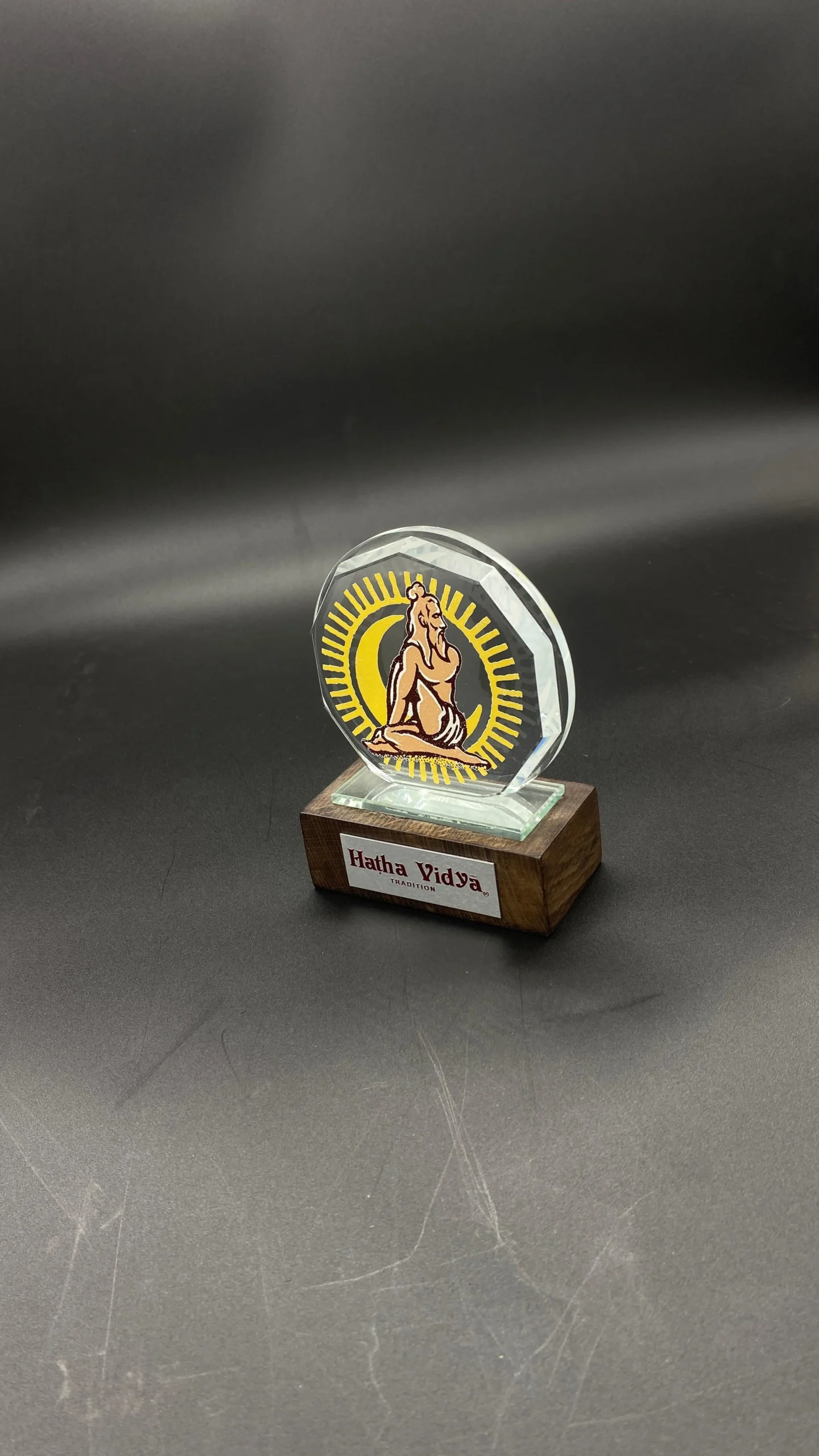 a 2D crytal trophy 6 & 8mm clear crystal top, enhanced with UV printing monted on wodden base, silver aluminium plate with UV priniting on it
